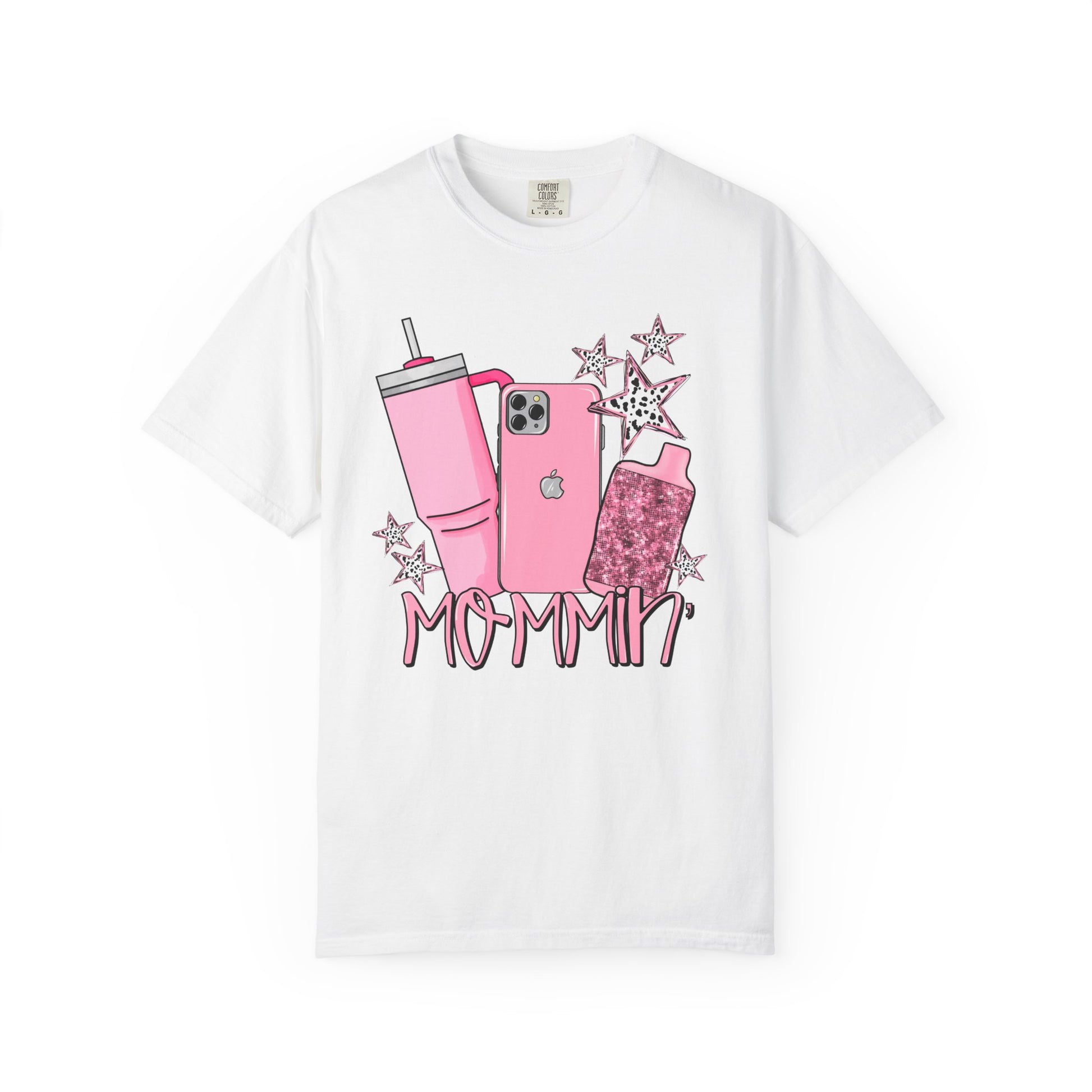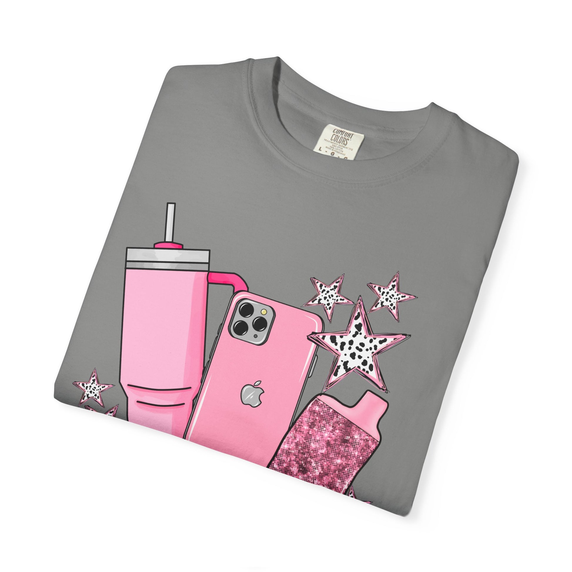 The design features your go-to lineup: a pink Stanley tumbler, matching iPhone, and yes — your beloved vape, all surrounded by playful pink stars. Whether you’re headed to school drop-off, Target, or just trying to keep it together, this tee’s got your back in the cutest way possible.